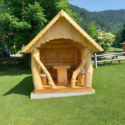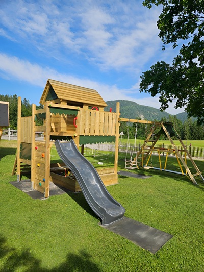 An unserem großen Spielplatz haben wir viele Fahrzeuge für die Kinder, einen Sandkasten mit dazugehörigen Utensilien, Schaukel, Rutsche, Wippe, Sitzmöglichkeiten, Liegestühle und Sonnenschirme.